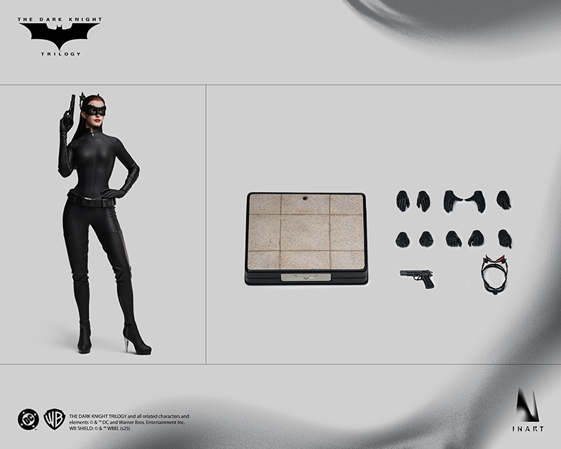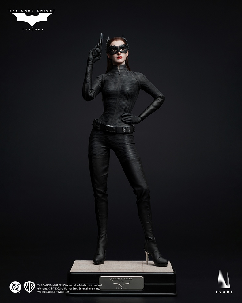 This INART Sixth Scale Collectible Figure is officially licensed by DC. The Catwoman figure meticulously captures Anne Hathaway's facial features, blending her beauty with the character’s bold, confident aura. Made from full silicone, it ensures natural body lines while avoiding joint exposure from the tight suit. The base is inspired by the garage where Catwoman first rides Batman's bike, with snow details evoking the wintry atmosphere of The Dark Knight Rises, adding cinematic authenticity to the figure.